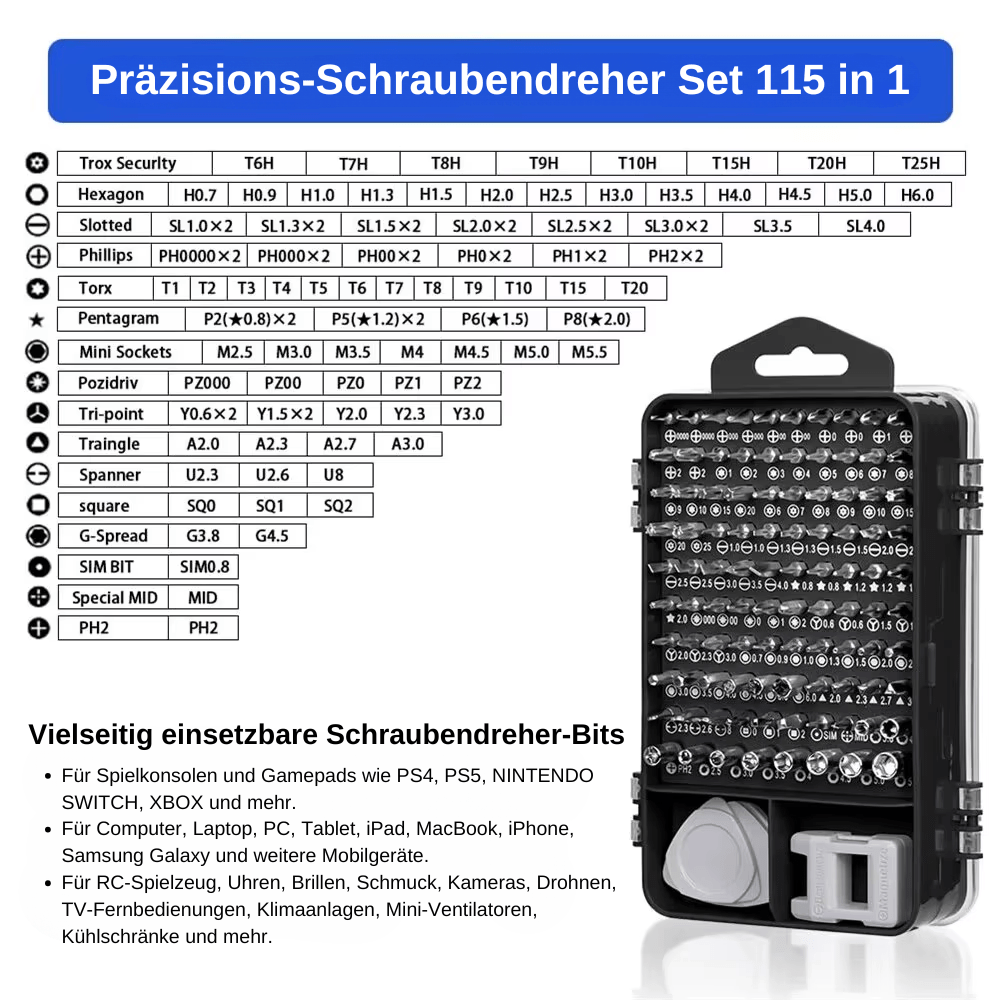Mit 115 unverzichtbaren Werkzeugen, darunter 98 Präzisions-Bits, ist dieses Set für alle Schraubentypen geeignet – Phillips, Torx, Allen, Pentalobe und mehr!