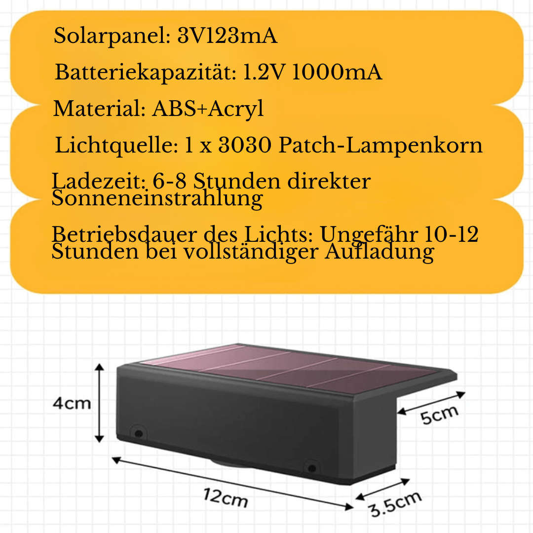 Beleuchten Sie Ihren Garten, Balkon oder Zaun auf moderne und effiziente Weise mit der Solar-Wandbeleuchtung für Außenbereiche. Mit ihrem eleganten Design und der Solartechnologie ist dieses Produkt die perfekte Lösung für alle, die eine beleuchtete und nachhaltige Umgebung wünschen.